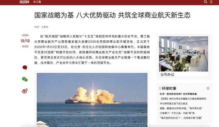 紧随其后的是光明网在12月的报道,文章标题直接点出“共筑寰宇新格局”,强调展会“已超越单一展会范畴”。中国科技网则以科技视角,指出商业航天是“典型的‘长链’产业”,市场前景广阔。