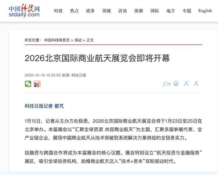 科技日报的报道从技术合作角度切入,强调了全球技术交流与合作的关键作用,并特别指出了投融资对产业发展的驱动价值。报道分析认为,本次展会将有力推动商业航天迈入“技术+资本”双轮驱动的新时代。