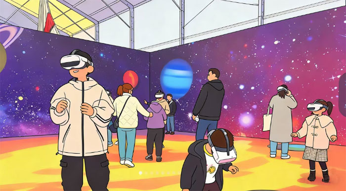 • 深度体验:在宏大展陈空间内,航天技术通过多元互动与场景化设计,变得真实可感、触手可及。参观者不仅能近距离观察珍贵火箭残骸,触摸历史的温度;还能进入太空旅游飞行器原型舱内,感受未来旅行;更能通过沉浸式VR漫游太阳系,在无人机竞技中感受操控乐趣。此外,细节拉满的空间站模型、可生成专属纪念版的头条报纸机,以及可以选购特色文创的太空茶吧,让探索之旅既硬核又充满趣味。